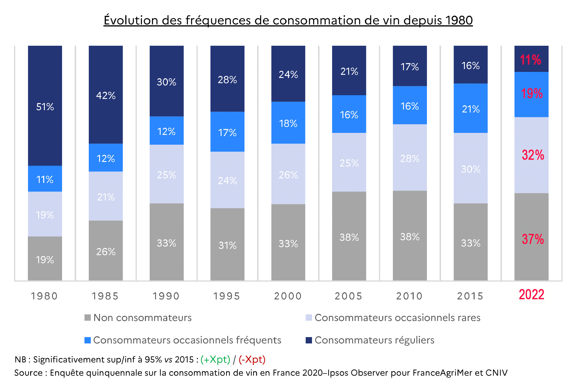 Quite frankly, I don’t care about the precise accuracy of these two figures, any more than of the FranceAgrimer charts showing that the proportion of French citizens who drink wine ‘frequently’ or ‘on frequent occasions’ has fallen from 37% in 2015 to 30% in 2022. They are telling the same story—one that is reflected in attitudes toward what one might call intermittent vegetarianism.